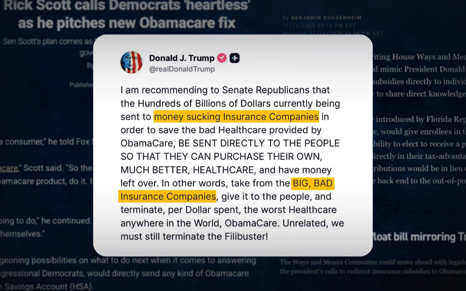 According to Politico, House Republicans on the Ways and Means Committee are circulating legislation that mirrors Trump’s demand to send subsidies “directly to the people” via HSAs, rather than through insurance plans. The proposal — introduced by Reps. Kat Cammack and Greg Steube — would allow ACA enrollees to divert their subsidies into HSAs instead of receiving financial assistance that, if it goes according to plan, would lower Americans’ out-of-pocket costs.