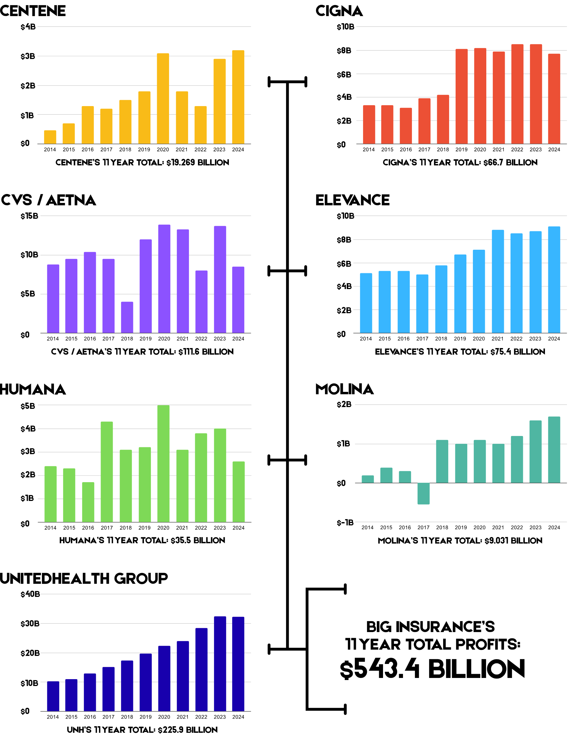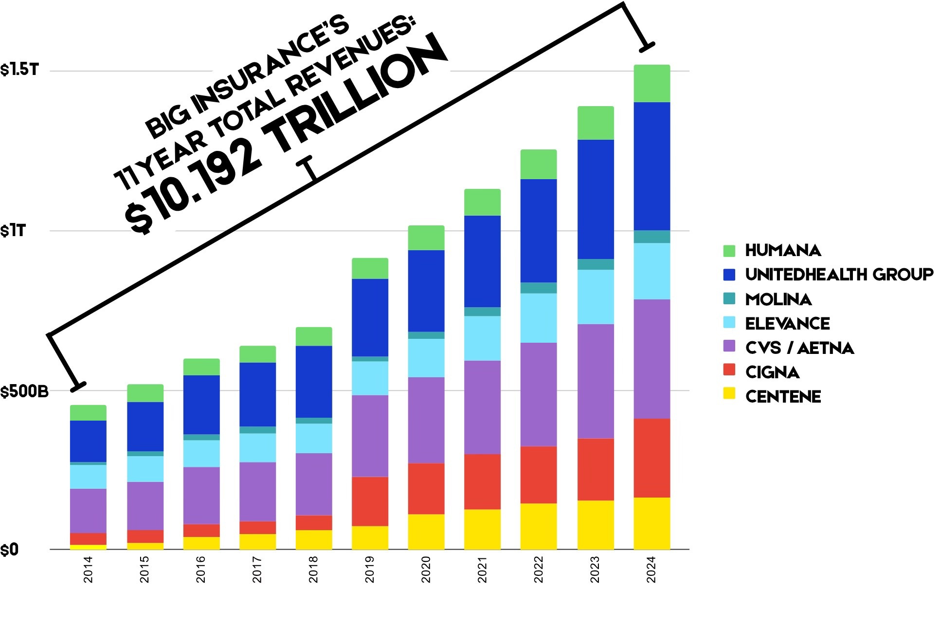 Since 2014, the seven largest for-profit insurers have taken in over $10 trillion in revenue — much of it from taxpayer-funded programs and health care businesses they now own outright.